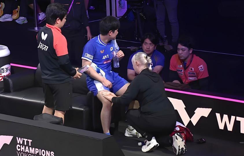决赛第六局打到最紧绷的时刻,王楚钦连追两局气势如虹,张本智和突然举手示意左腿不适,申请医疗暂停。比赛中断整整五分钟,全场目光聚焦在理疗师身上。