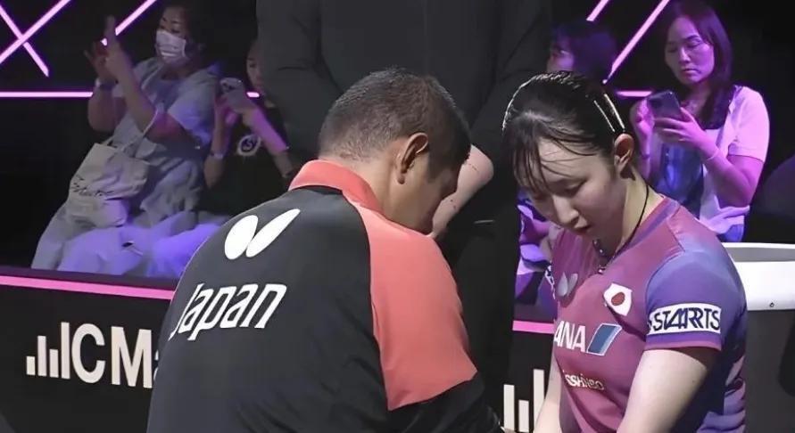 决胜局关键分阶段,早田希娜申请暂停后,走进场内的不是医护人员而是她的教练冈雄介。两人低头密语长达数分钟,镜头清晰捕捉到教练嘴唇快速开合布置战术的动作。