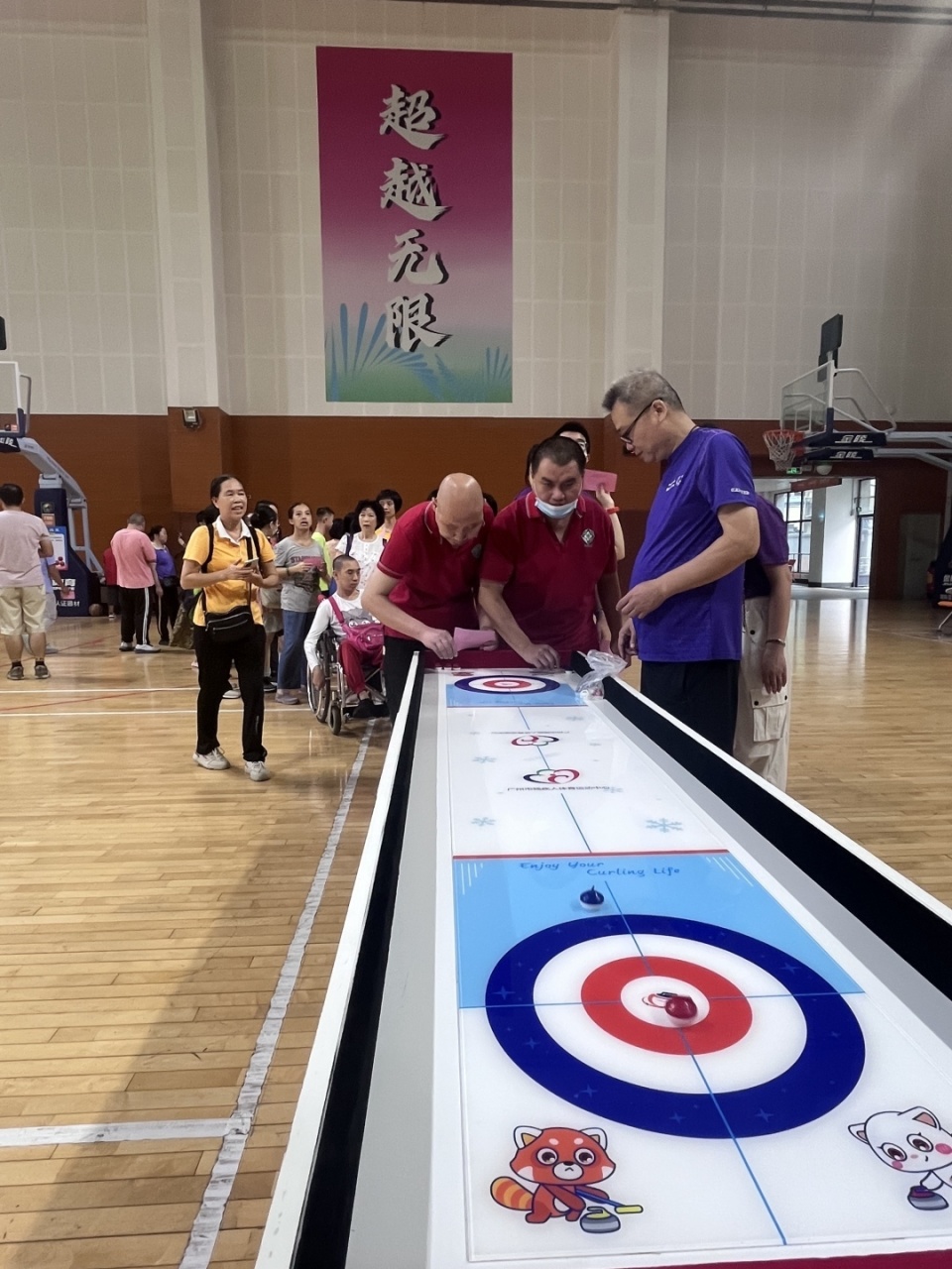 旱地冰壶作为一项融合策略与协作的运动,因其规则简明、安全性高,成为特奥日活动中备受欢迎的项目,现场大排长龙。参与者屏息凝神,手臂力量在一瞬间聚集,冰壶“唰”的一声滑向远方。无论是初次尝试的新手,还是有经验的“老将”,都在投掷、碰撞、配合中享受着运动的乐趣,脸上洋溢着自信的笑容。