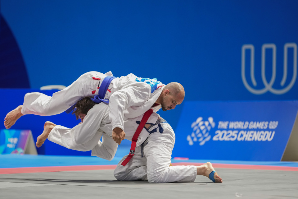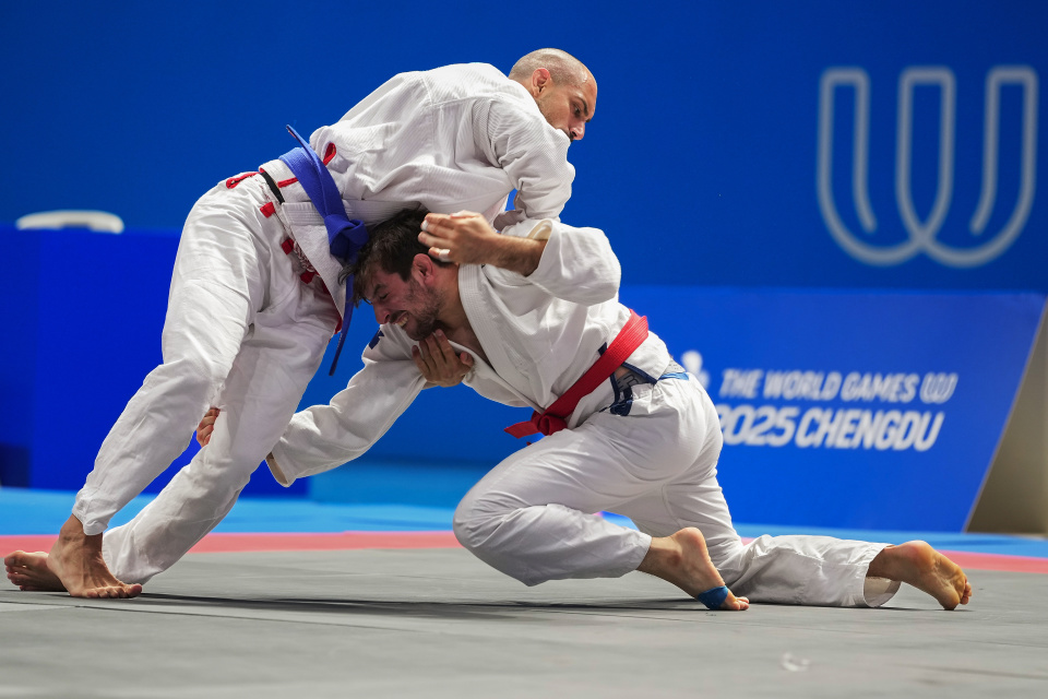 当日,在2025年成都世运会柔术男子寝技无差别级金牌赛中, 以色列选手赖德战胜加拿大选手多斯·桑托斯,获得冠军。8月12日,赖德(下)与多斯·桑托斯在比赛中。新华社记者 江宏景 摄